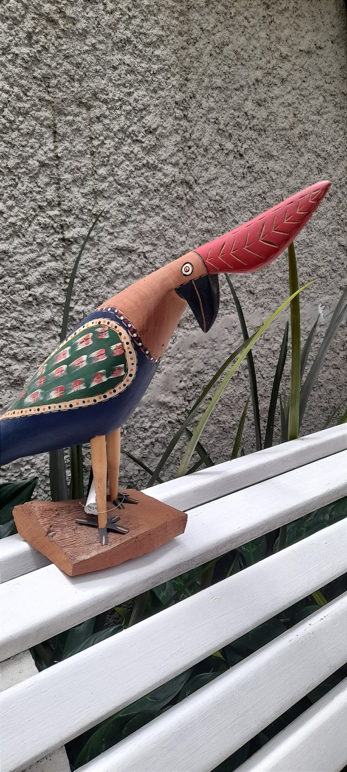 Pássaro vermelho e azul em madeira, de Sérgio Teofilo, tamanho médio.